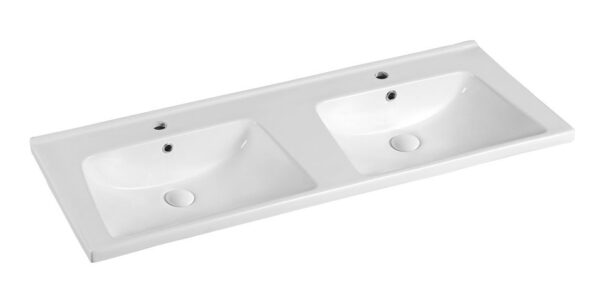 A double sink vanity is designed to bring convenience and efficiency to shared bathrooms. Bold rectangular design with precision-crafted thin edges. Durable easy-clean ceramic surface. Adds contemporary elegance to any bathroom space.